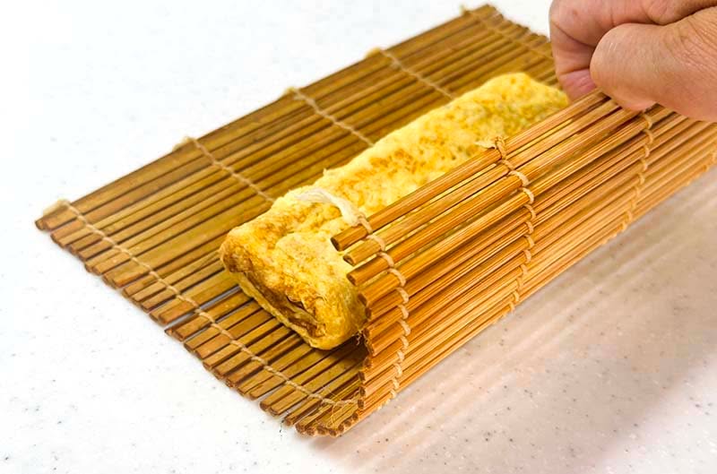 A bamboo mat, called makisu, is a traditional Japanese cooking tool. It is made by finely splitting bamboo, with each piece carefully tied together using cotton thread. A makisu is most commonly used for rolling sushi, and it is also handy for shaping Japanese omelettes. I like to place the omelette on the natural side- the bamboo bark side, to give it a smooth surface.