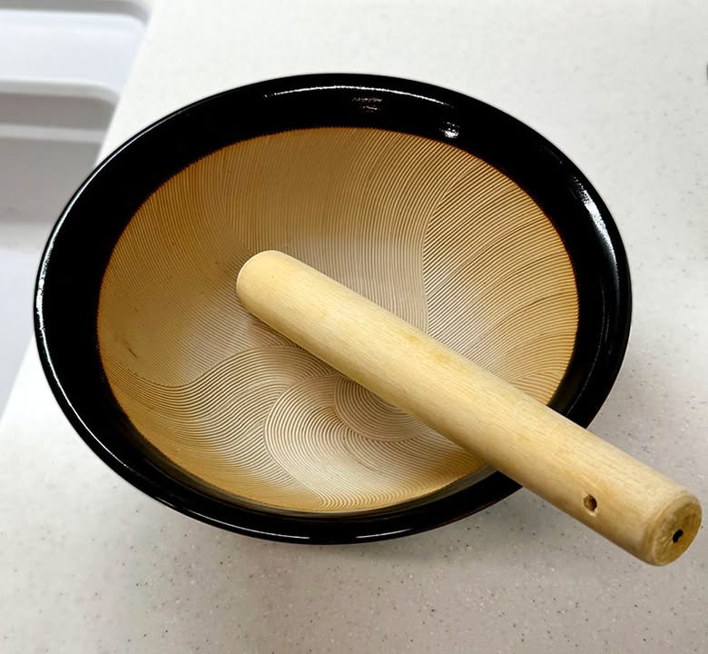 This is a suribachi and surikogi, the traditional Japanese mortar and pestle. The surikogi is a rounded wooden stick used to grind ingredients against the rough inner surface of the suribachi bowl. They’ve been used for centuries to grind sesame seeds, mountain yam, and tofu. To be honest, I don’t use them very often these days- the rough surface makes them a little tricky to clean!