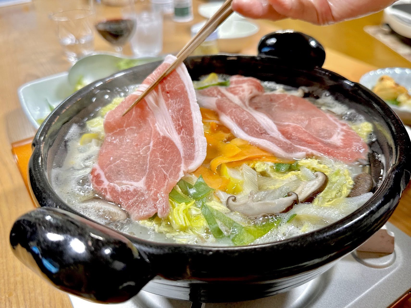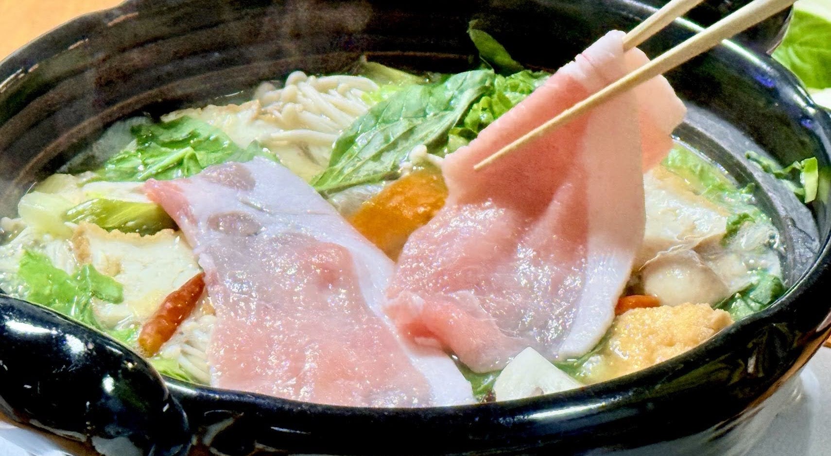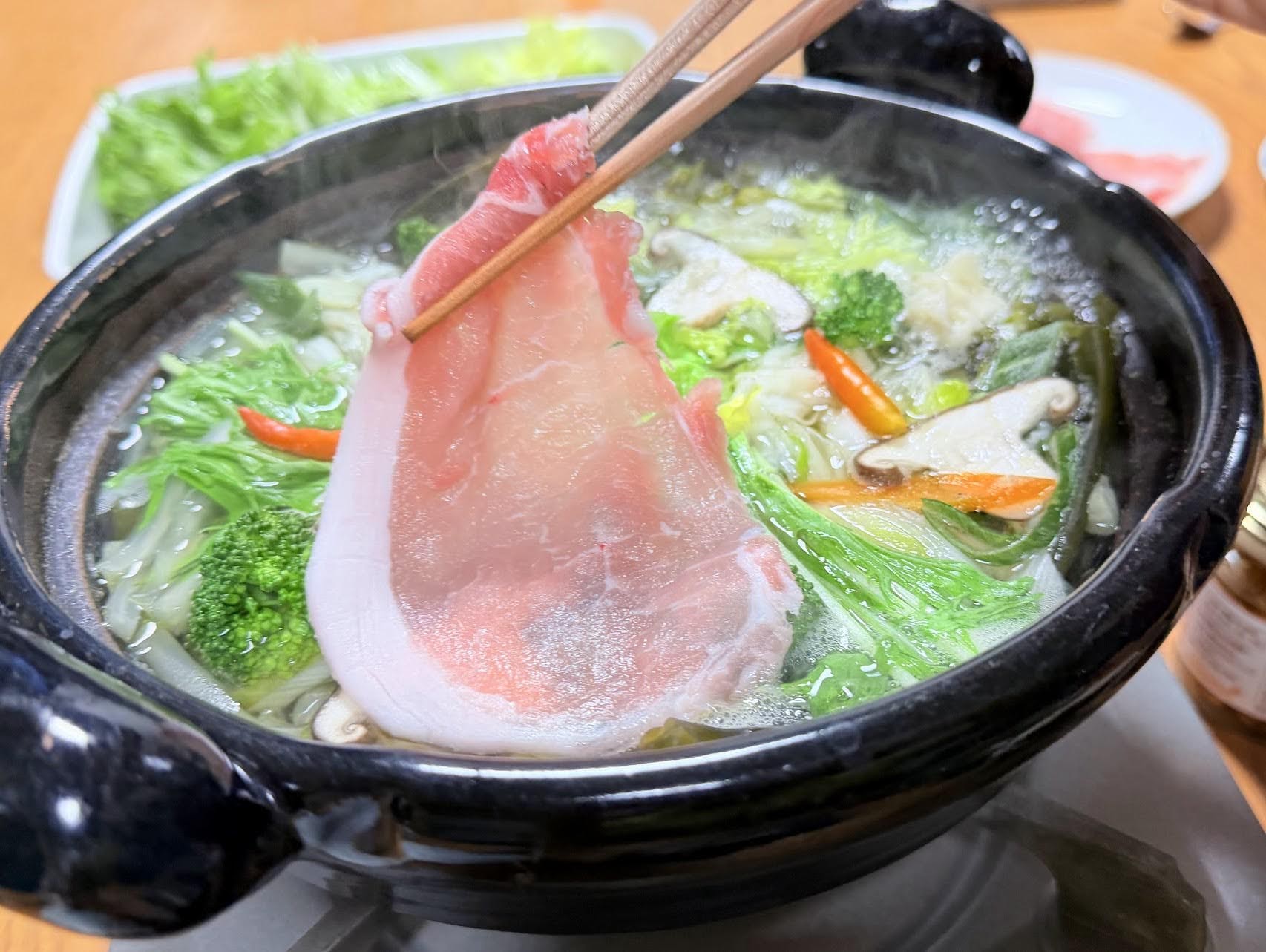 Seasonal vegetables are cooked in a light kombu dashi(kelp broth), and thinly sliced pork is briefly swished through the soup until just tender, allowing the natural flavors to come together.