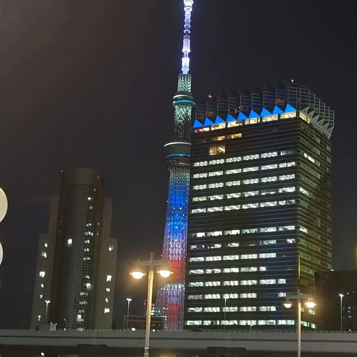 Tokyo Skytree lit up with special lighting inspired by the American flag in response to the visit of the President of the United States.
