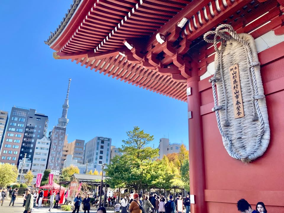 The "Yamagata Prefecture Murayama City Tourism and Product Exhibition" is currently being held in the grounds of Sensoji Temple.There are stalls selling locally grown vegetables, local sake, Yamagata specialties such as taro stew and ball konnyaku.The event will be held today from 10am to 3pm.The large straw sandals hanging on the Hozomon Gate were donated by Murayama City, Yamagata Prefecture, and have been replaced approximately once every 10 years since 1941.This offering became the catalyst for an exhibition of the city's products to be held annually at Sensoji Temple.